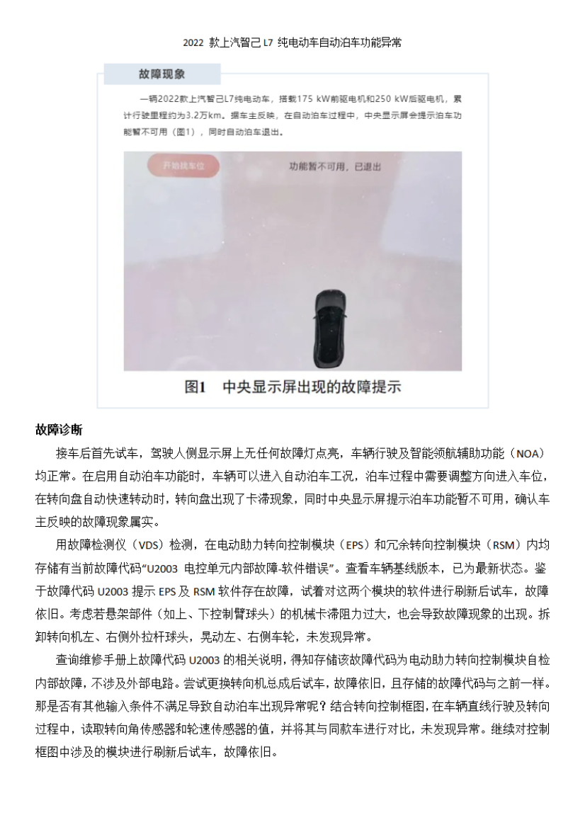 2022 款上汽智己L7 纯电动车自动泊车功能异常