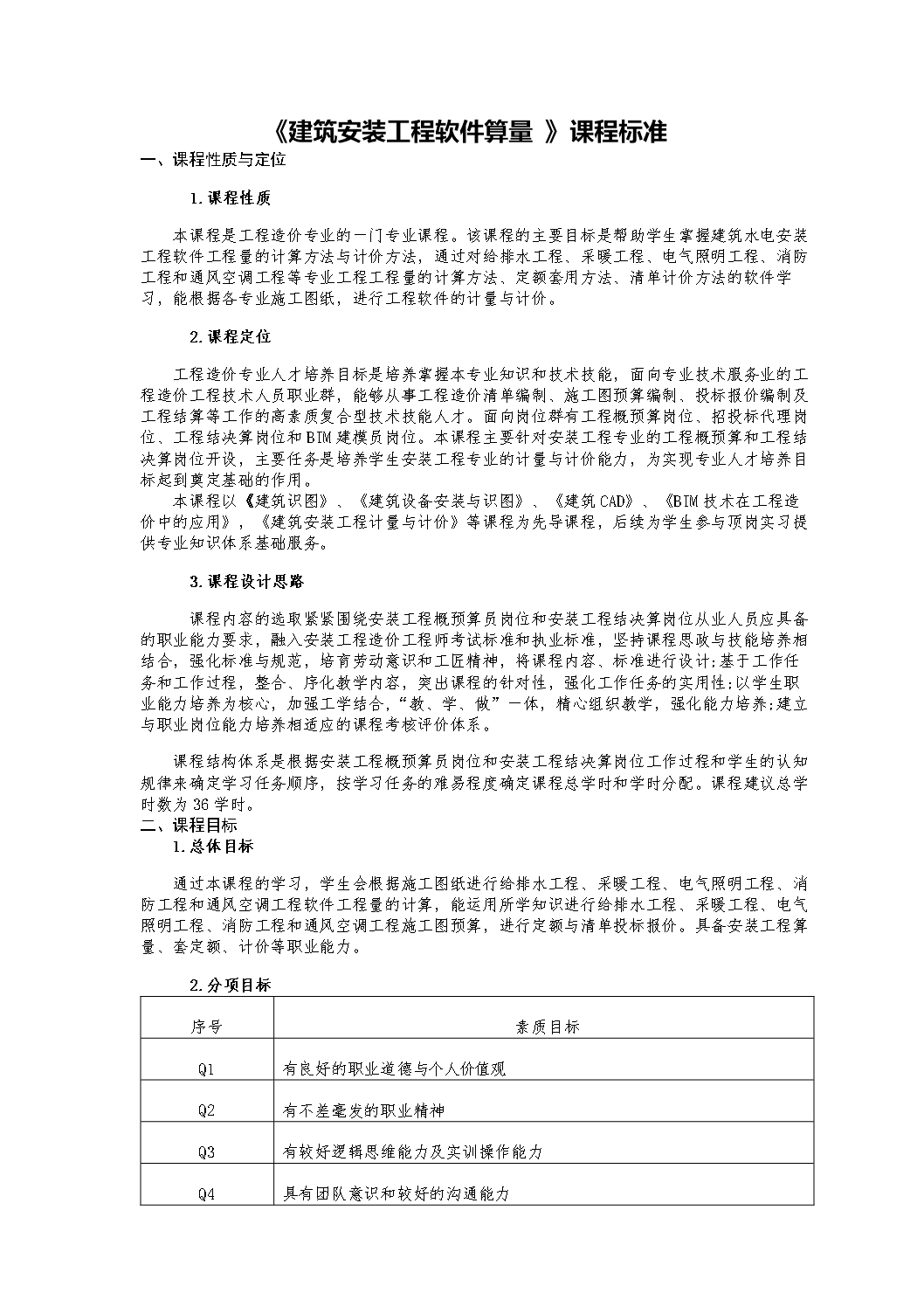 2024年《建筑安装工程软件算量 》最新课程标准