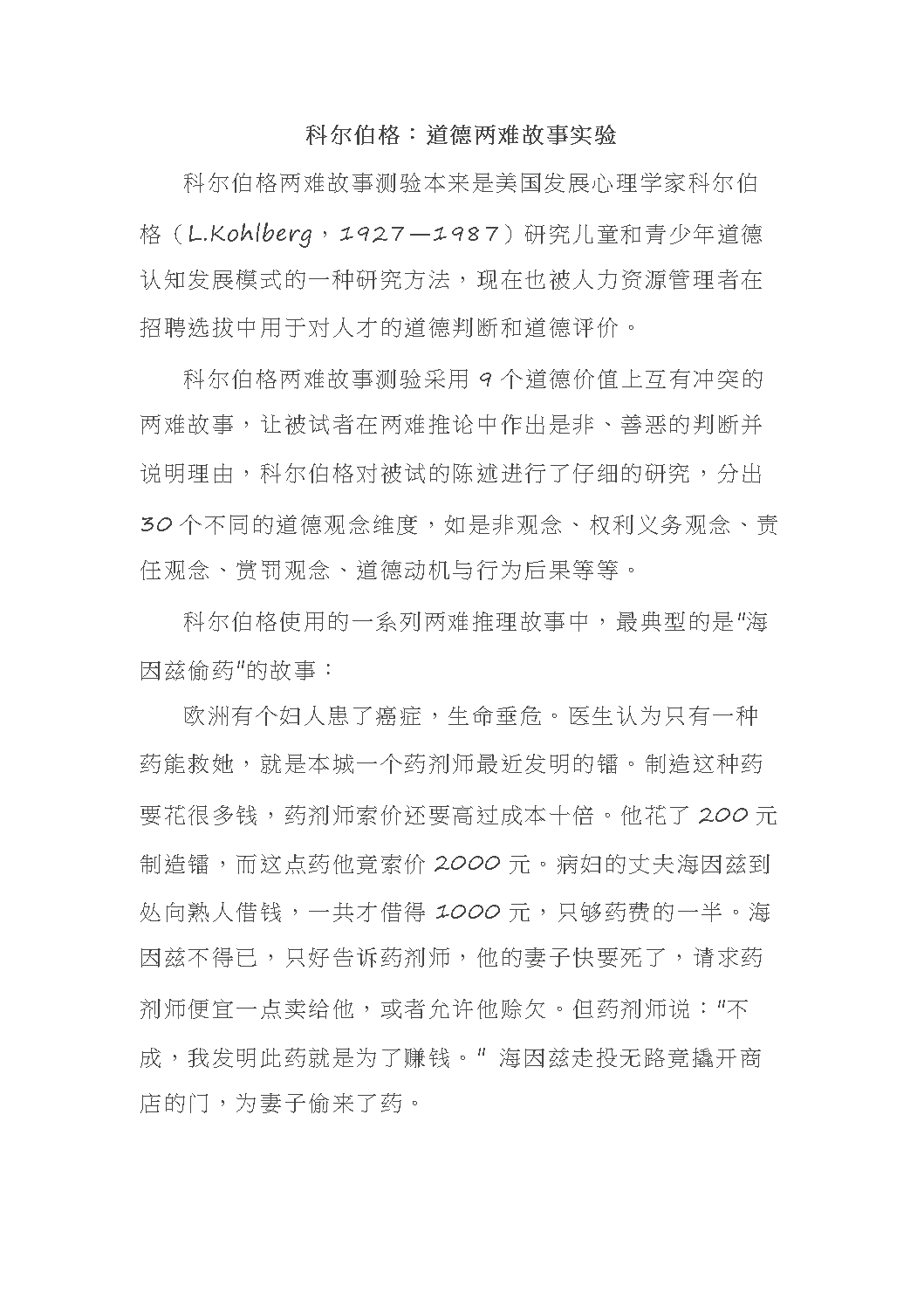 科尔伯格:道德两难故事实验